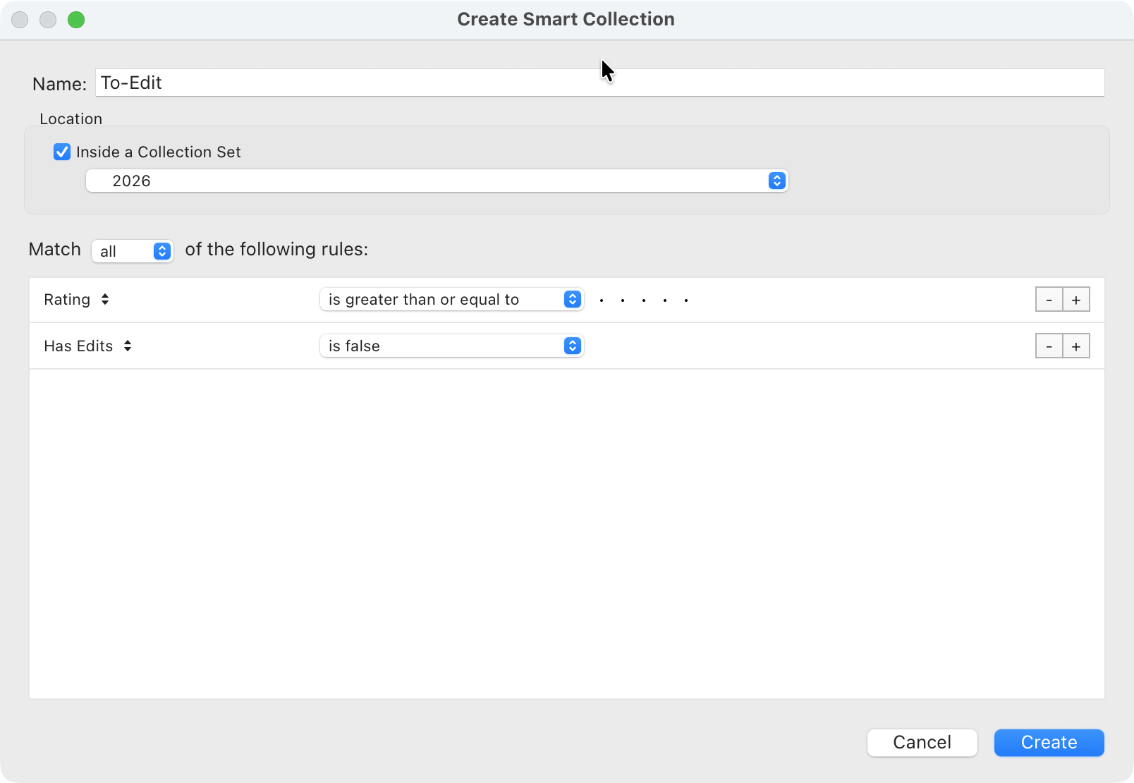 You also mentioned using Collection Sets for photos you still need to edit. To keep your workspace clean, create a Smart Collection with these rules: